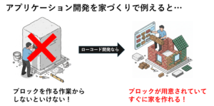 しかし、ローコード開発では既に「ブロックが用意されている」状態なので後はブロックを組み立てるだけ!なんですね。