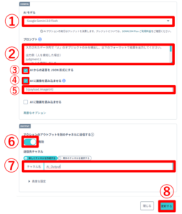 ③「AIからの返答をJSON形式にする」のチェックボックスを押下(ONにする)。