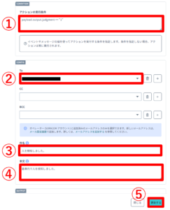 ①「アクション実行条件」に「payload.output.judgment == “1”」と記入する。