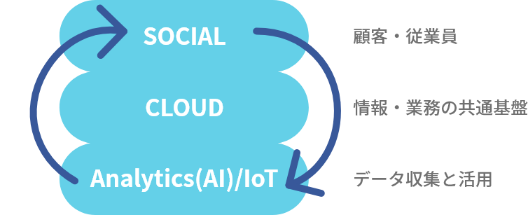 これはSMACIT(Social、Mobile、Analytics(AI)、Cloud、IoT。DXを支える主要なテクノロジー)を個別技術としてではなく連携構造として捉え基盤化し、データの収集と活用のサイクルを継続的に回していることにほかなりません。
