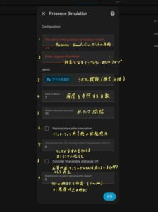 | 1. The name of the presence simulation switch | 作成されるスイッチの表示名 | Holiday Presence など。この名前が switch.presence_simulation 等のエンティティIDになります。 |