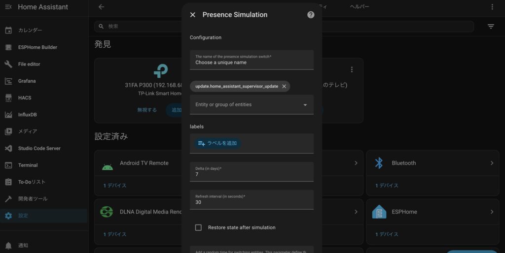 - ダウンロードが完了したら、一度Home Assistantを再起動します。再起動後、「設定」→「デバイスとサービス」を開き、「統合を追加」ボタンを押下します。 検索窓で「Presence Simulation」を検索し、選択します。
