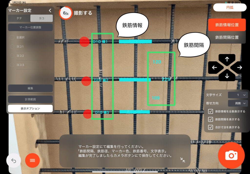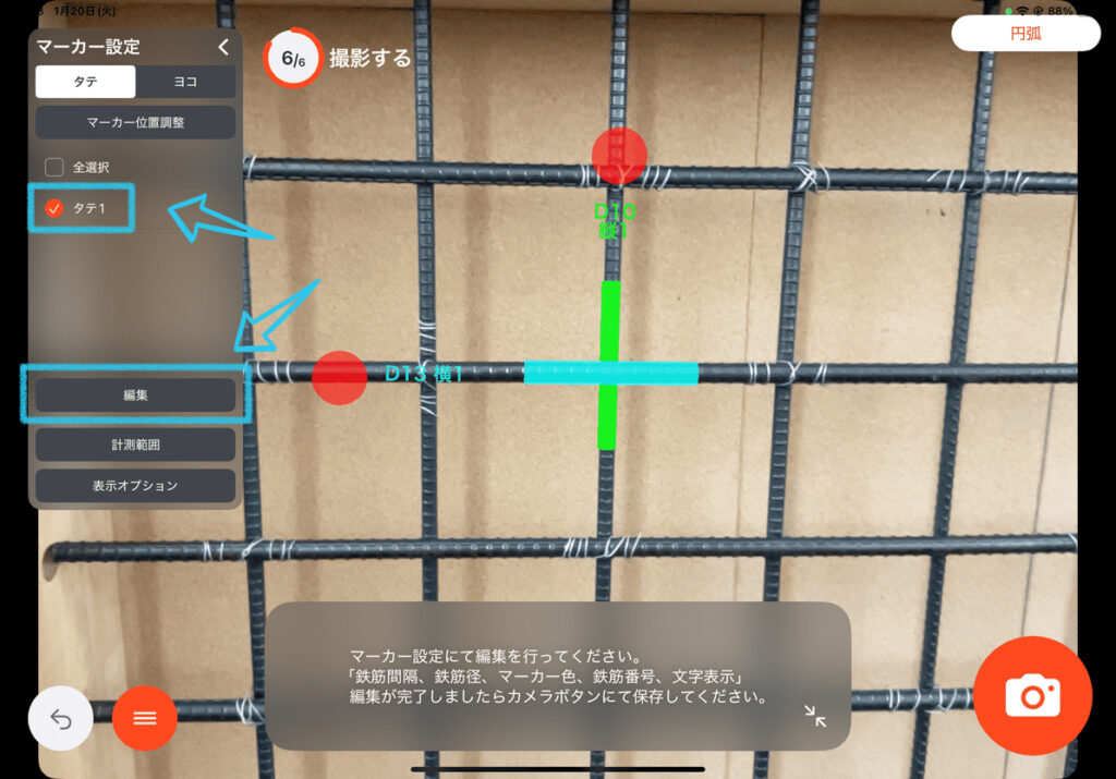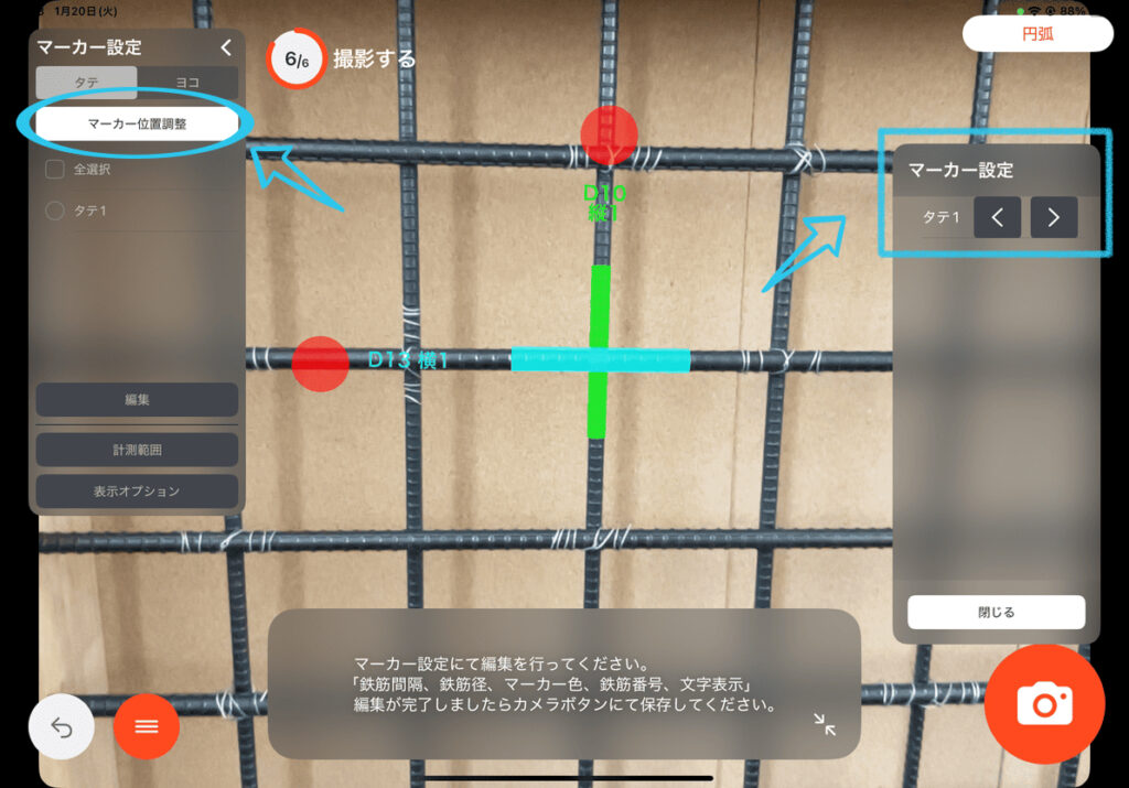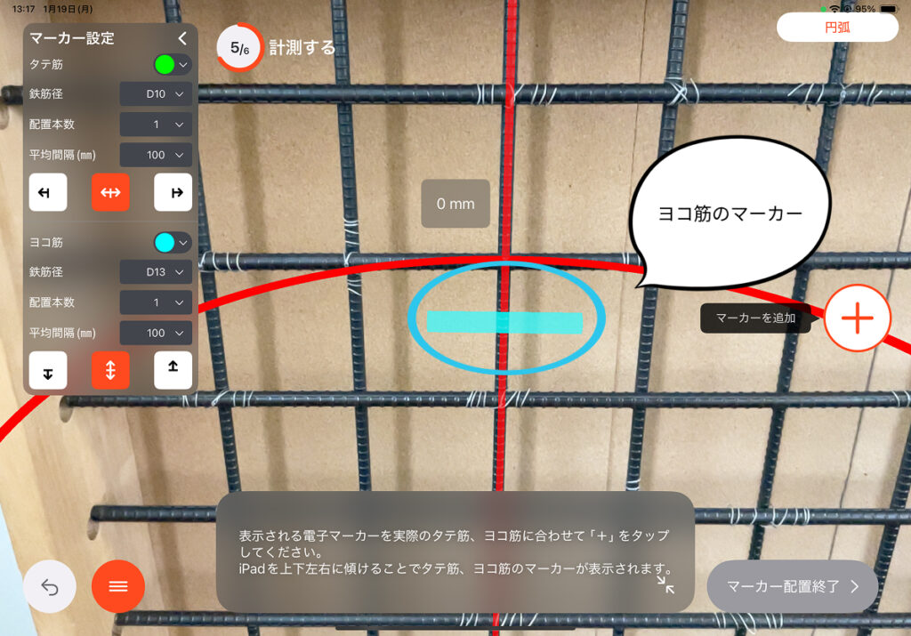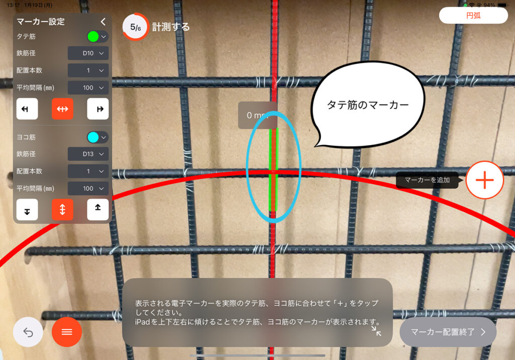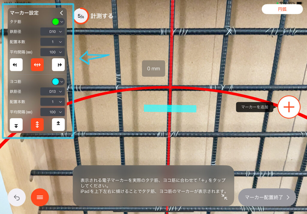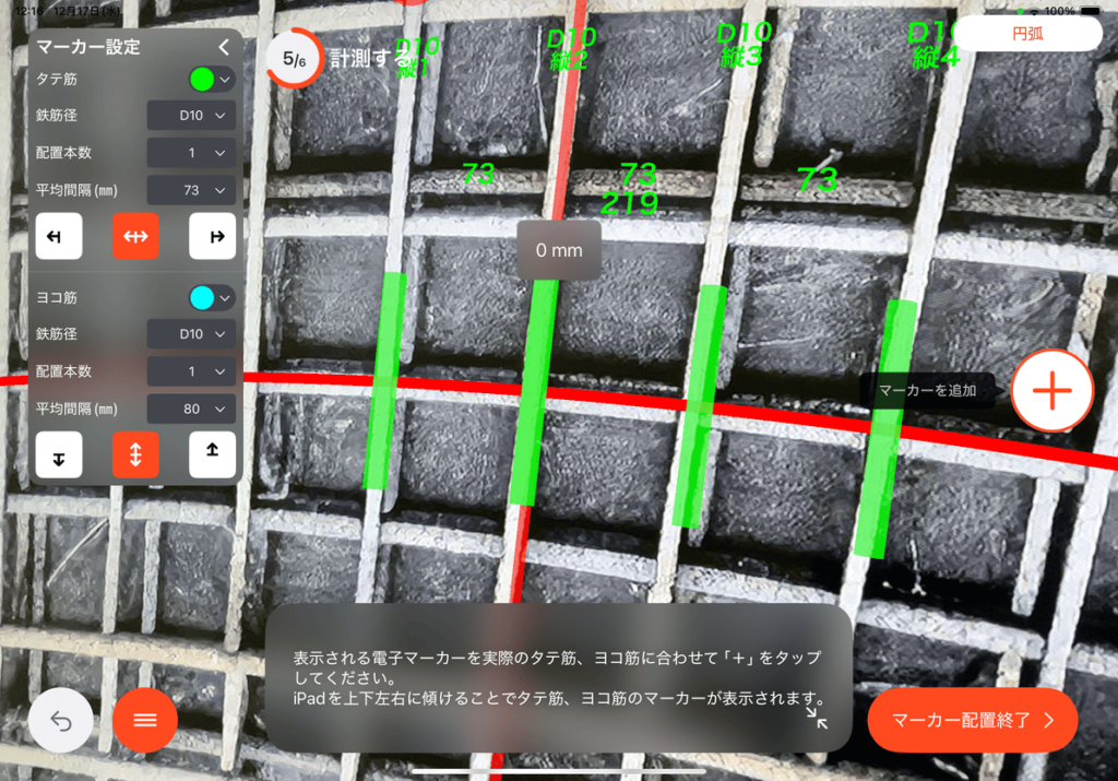 タブレットを上下に傾けるとヨコ筋、左右に傾けると円弧状(タテ筋)の配筋にマーカーを追加できます。