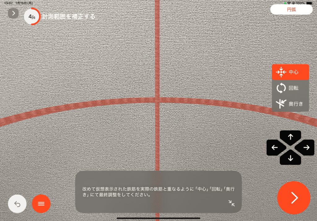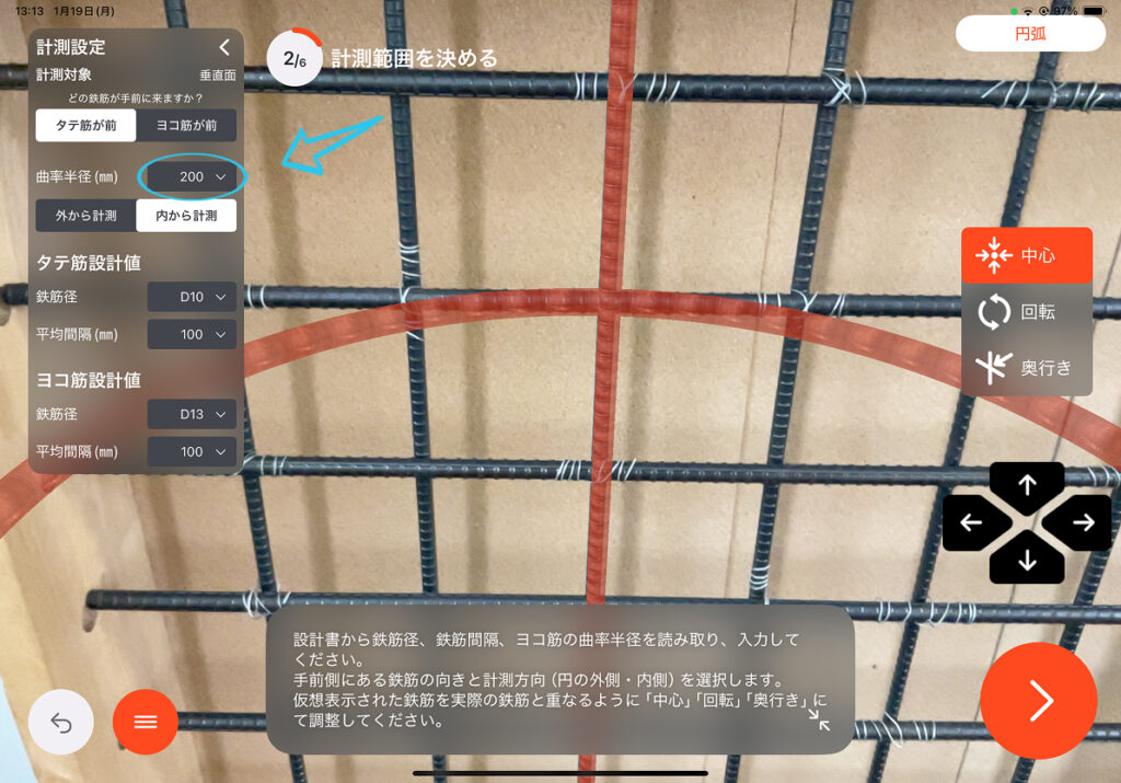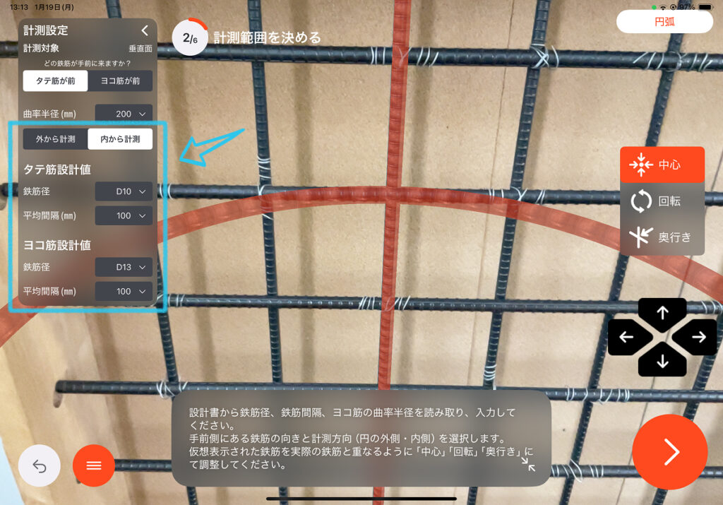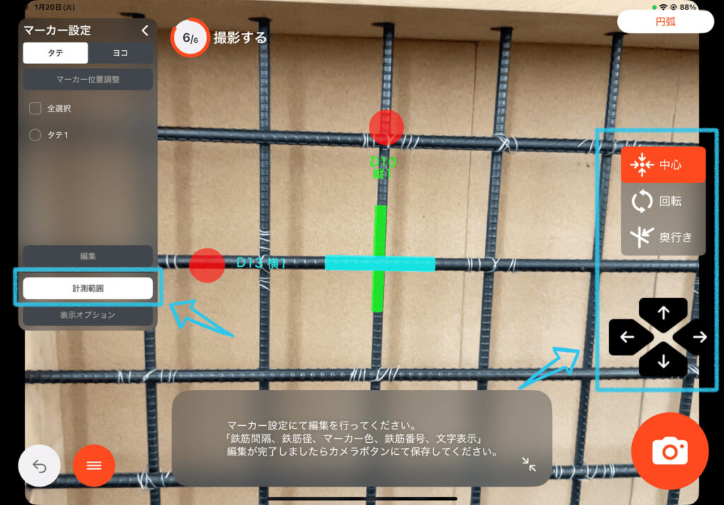 計測範囲をタップすると、右側で「中心」「回転」「奥行き」の再調整が行えます。 この調整はマーカーごとではなく、全体の調整になります。