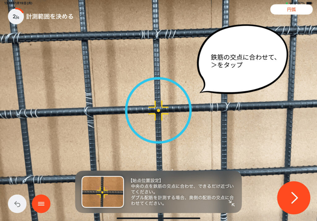 鉄筋の交点に中央のマークを合わせ、「>」をタップします。