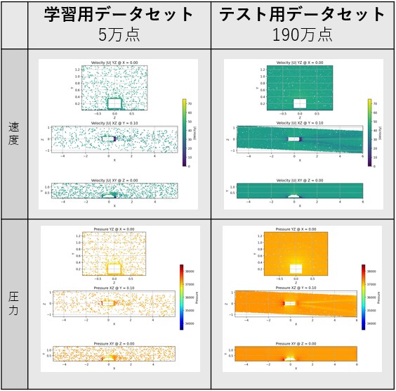 そこで本検討では、WindsorMLデータのごく一部のみを使用した場合に、PINNモデルがどの程度流れ場を再現できるのかを検証しました。元データは約2億点ですが、ベースライン用のデータとして約200万点(約1%)を抽出し、PINNの学習にはさらに少量の50,000点(約0.025%)を用いました。