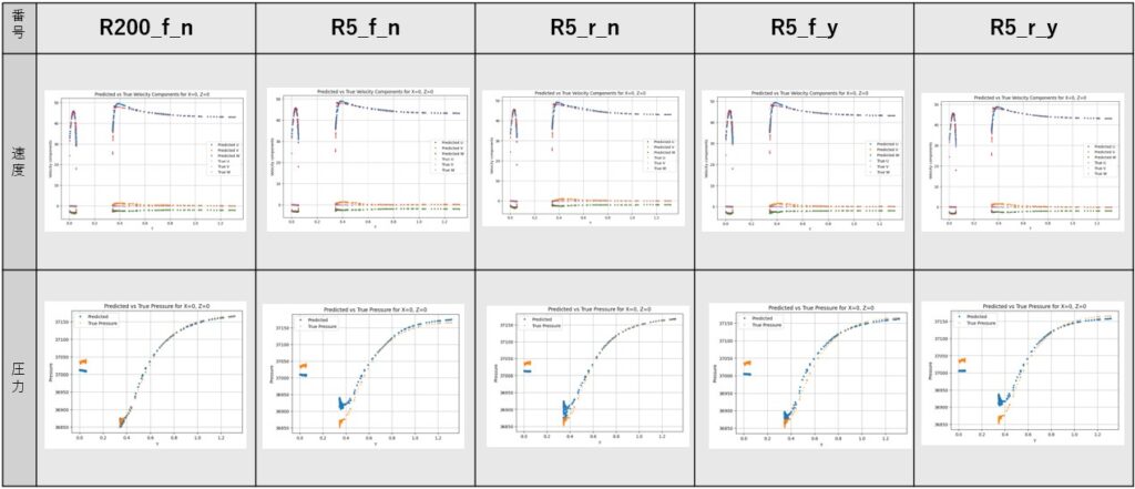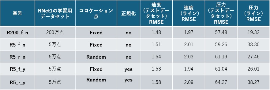 ここで用いるモデル名の表記は、R200/R5=RNet学習点数(200万/5万)、f/r=コロケーション点(fixed/random)、y/n=座標正規化(yes/no)を表します。表1には、PINNモデルの計算結果とテストデータとの差を表すRMSE誤差を示しています。RMSEは、テストデータ全体を用いた場合と、測定線上の点のみを用いた場合の2通りで算出しました。