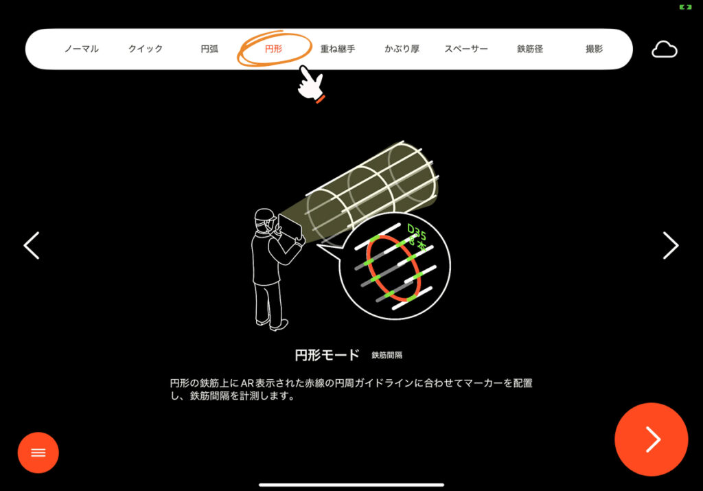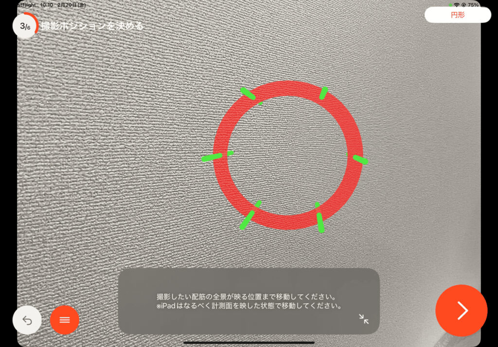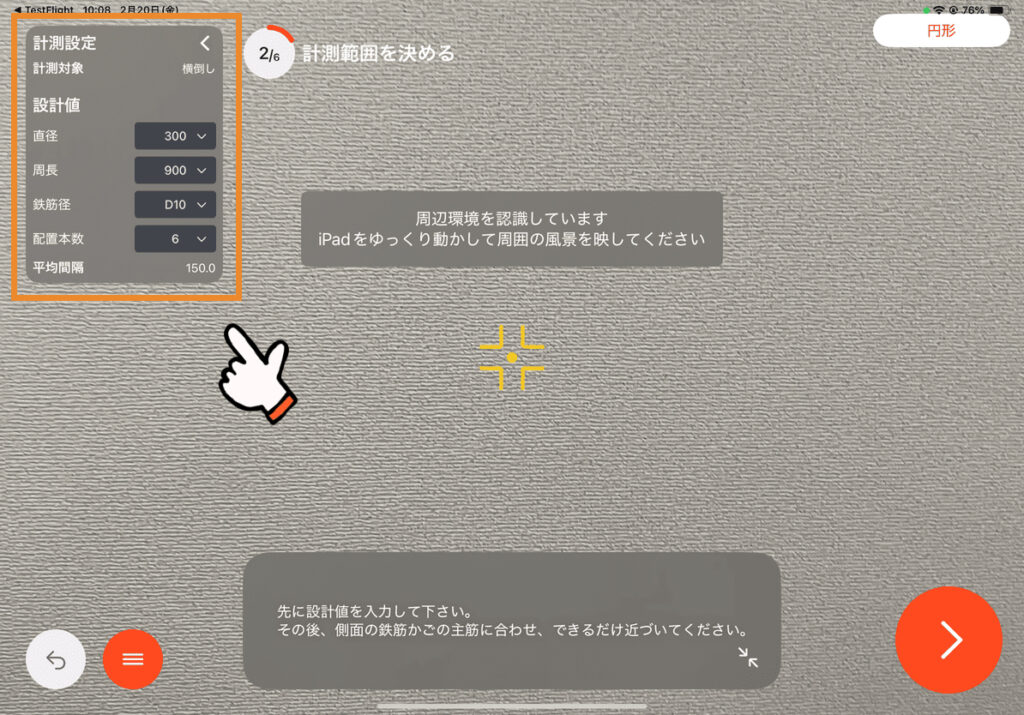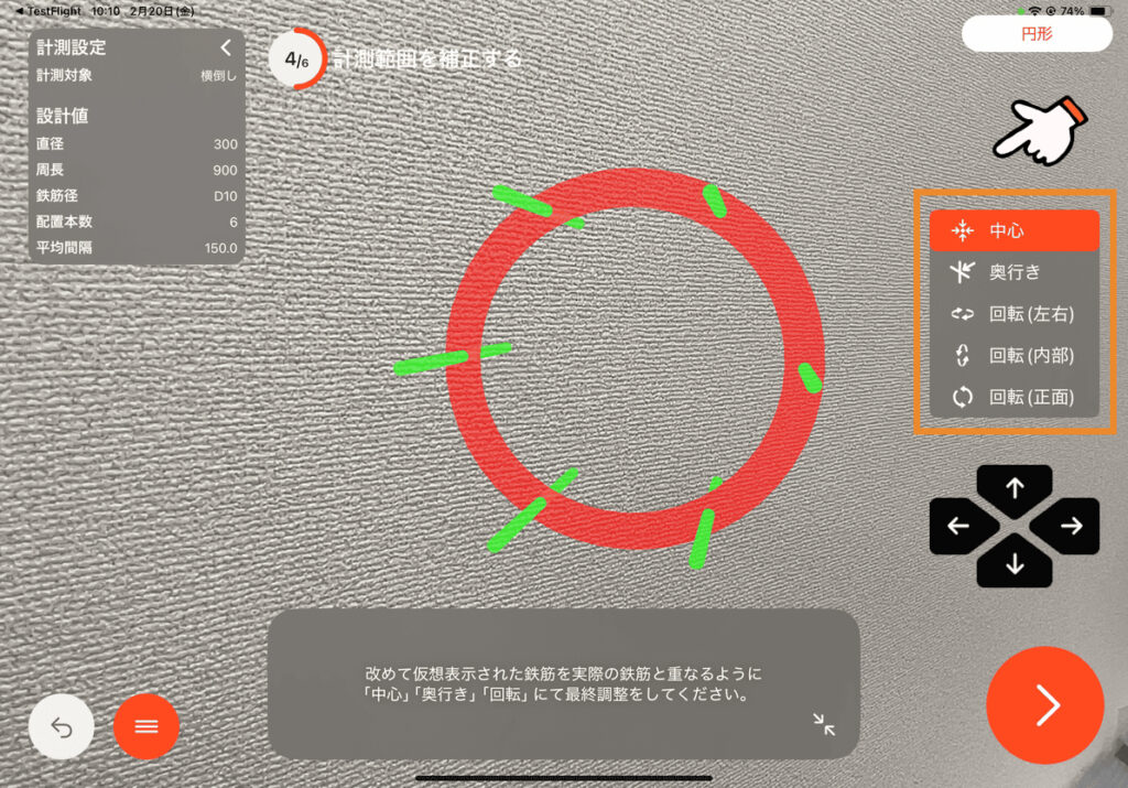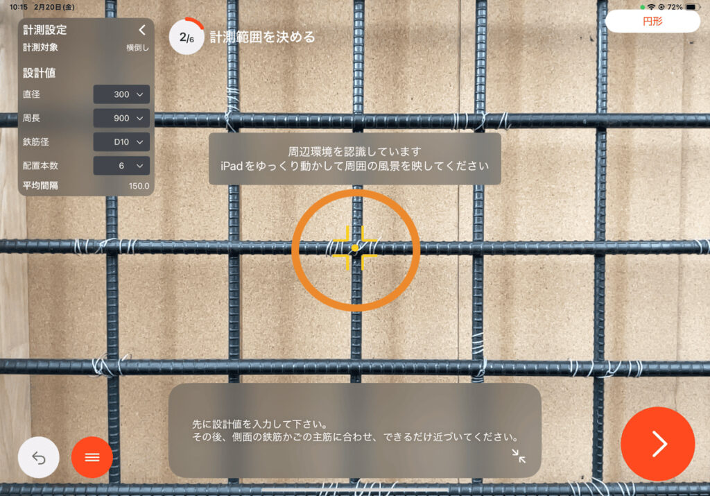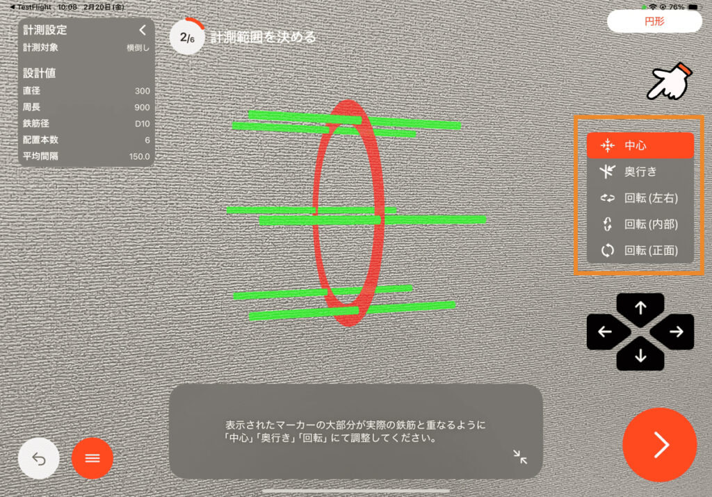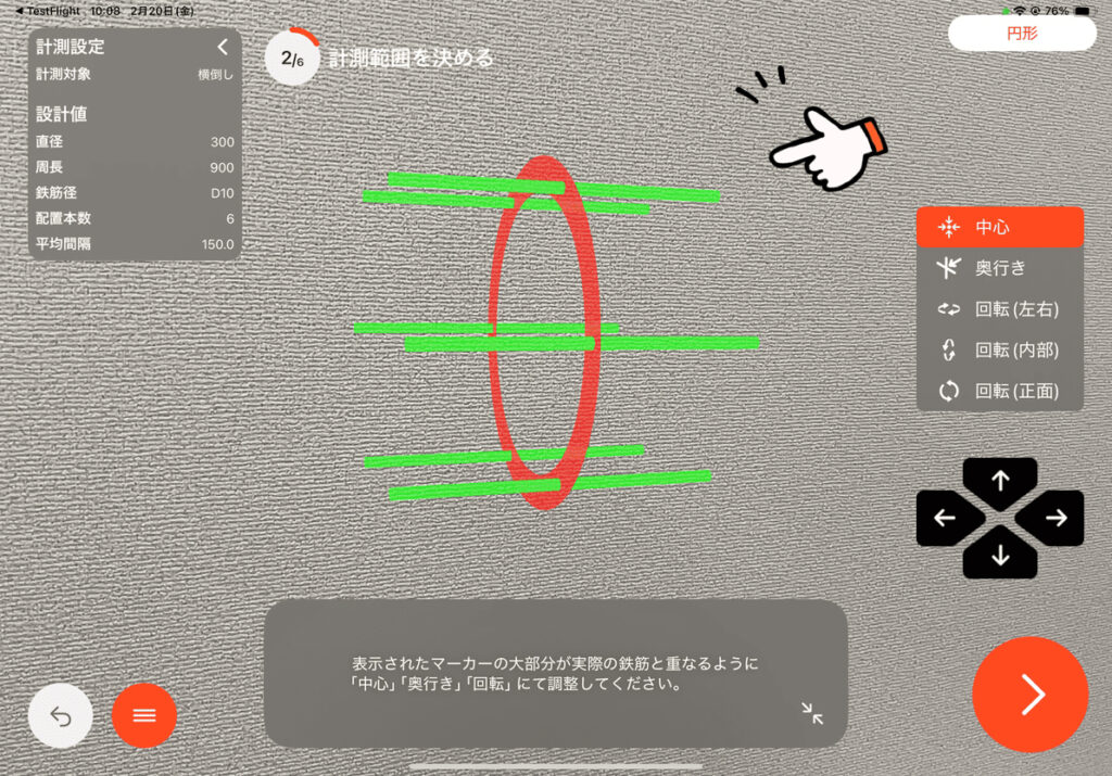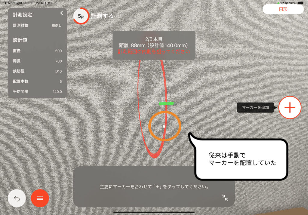 今回のリニューアルで、この「手動でARマーカーを配置する操作」が不要になりました。 リニューアル後の円形モードでは、入力した設計値から計算されたARマーカーが自動で表示されます。 表示されたARマーカーと実際の鉄筋が重なるように調整すると、計測を行えます。 さらにARマーカー自体の表示を長く改良したため、鉄筋との調整も行いやすくなっています。操作手順