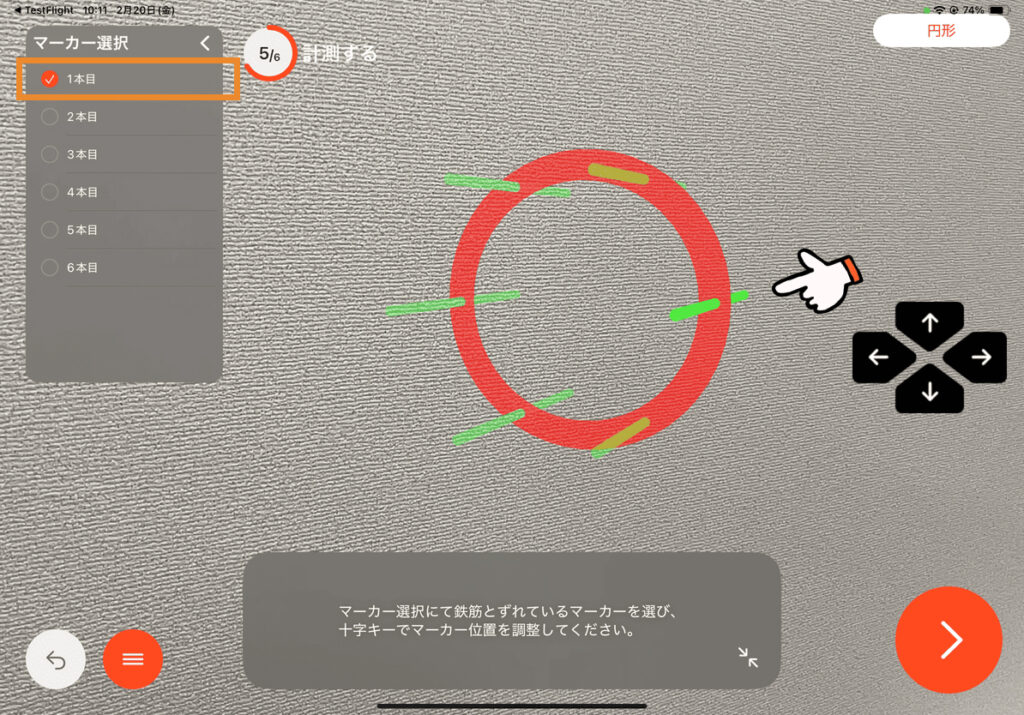 ARマーカーが各々の鉄筋に正確に重なるように、最終の位置調整を行います。 左側のマーカー選択パネルから、調整したいマーカーを選択すると、該当するARマーカーの色が濃く表示されます。 実際の鉄筋に重なるように、右側の十字キーで調節してください。