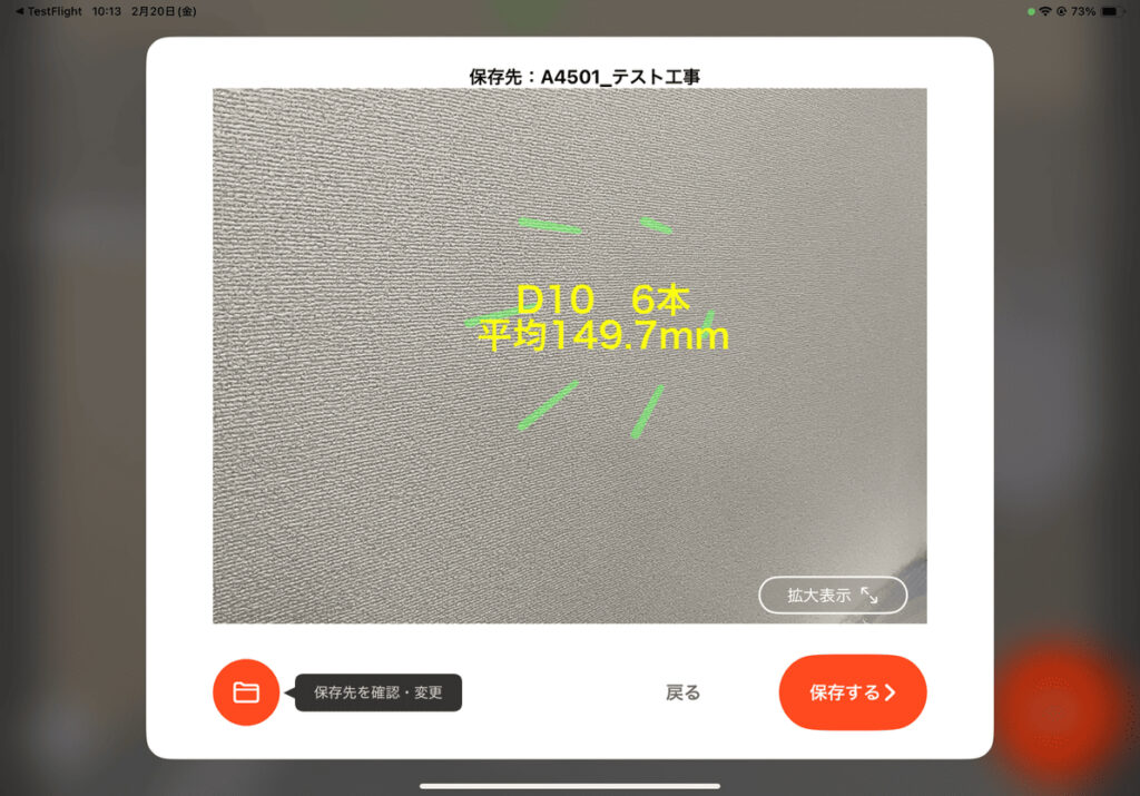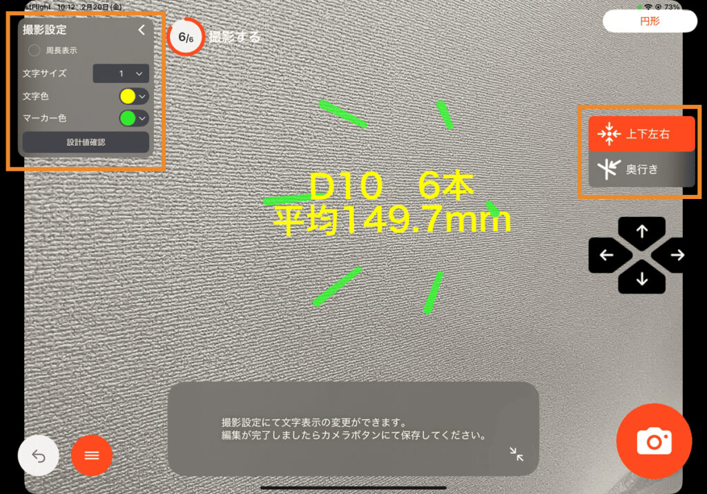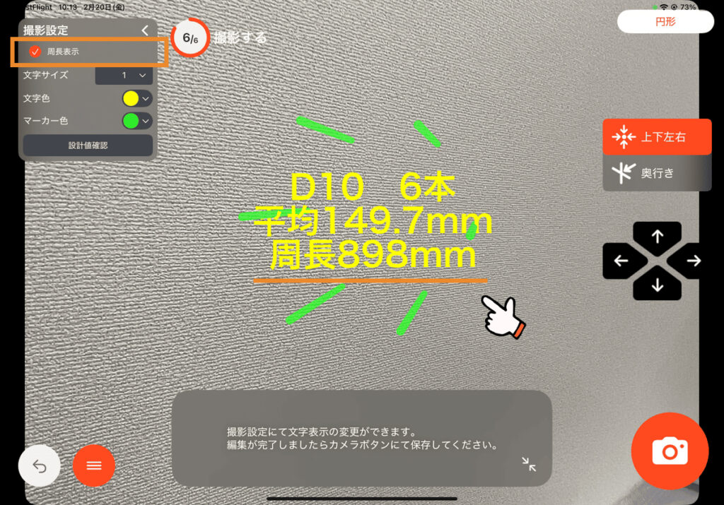 位置調整が完了すると、計測された鉄筋の平均間隔が表示されます。 左側の撮影設定パネルでは、計測結果の文字サイズ・文字色、マーカー色を変更できます。 右側の位置調整パネルでは、計測結果の表示位置を調整できます。