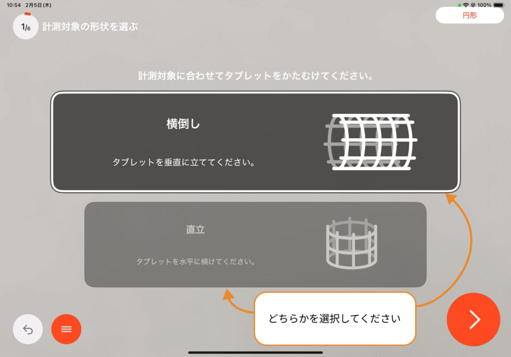 鉄筋かごの状態に合わせて「横倒し」または「直立」を選択してください。