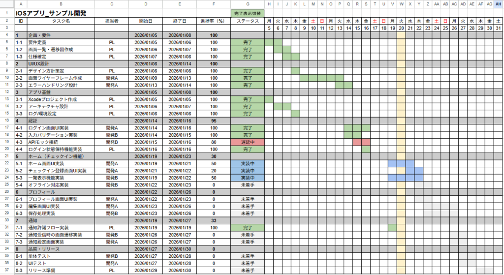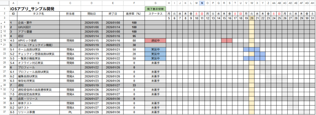 ここまでで、子タスク(例:1-1)の開始日・終了日・進捗率・ステータスを更新すれば、ガント側の色も連動して変わる状態になりました。