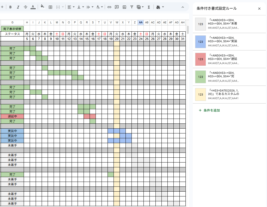 ここまでで、「WBS側の開始日・終了日・ステータスが変わると、ガントチャート該当範囲の色塗りが自動で更新される。」という状態が完成しました。