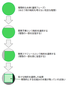 開発プロジェクトには、期間や予算、構成メンバー等の制約があるので、何をどこまで追及してゴールと設定するのかは、各プロジェクトにより異なってきますが、理想とする未来の状況から逆算して必要な要素を現時点のプロジェクトに適用するような事が必要となります。