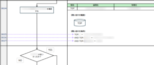 また、内部設計において、1文節1仕様の記述だけでは、処理の流れが把握しにくい事から、紙面の左半分をフローチャート、右半分を仕様記述という形で併記する事により、他の人が読んでも