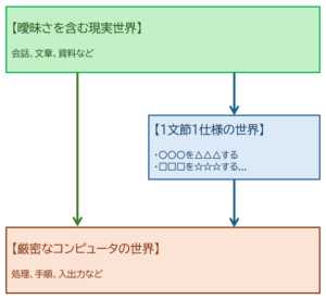 曖昧な表現である文章を、0,1しかない厳密なコンピュータの世界の振る舞いとして直接落とし込むわけですから、当然のように漏れや、本来の解釈とは異なる解釈で仕様が作成されるリスクが高まります。(イメージ緑矢印)